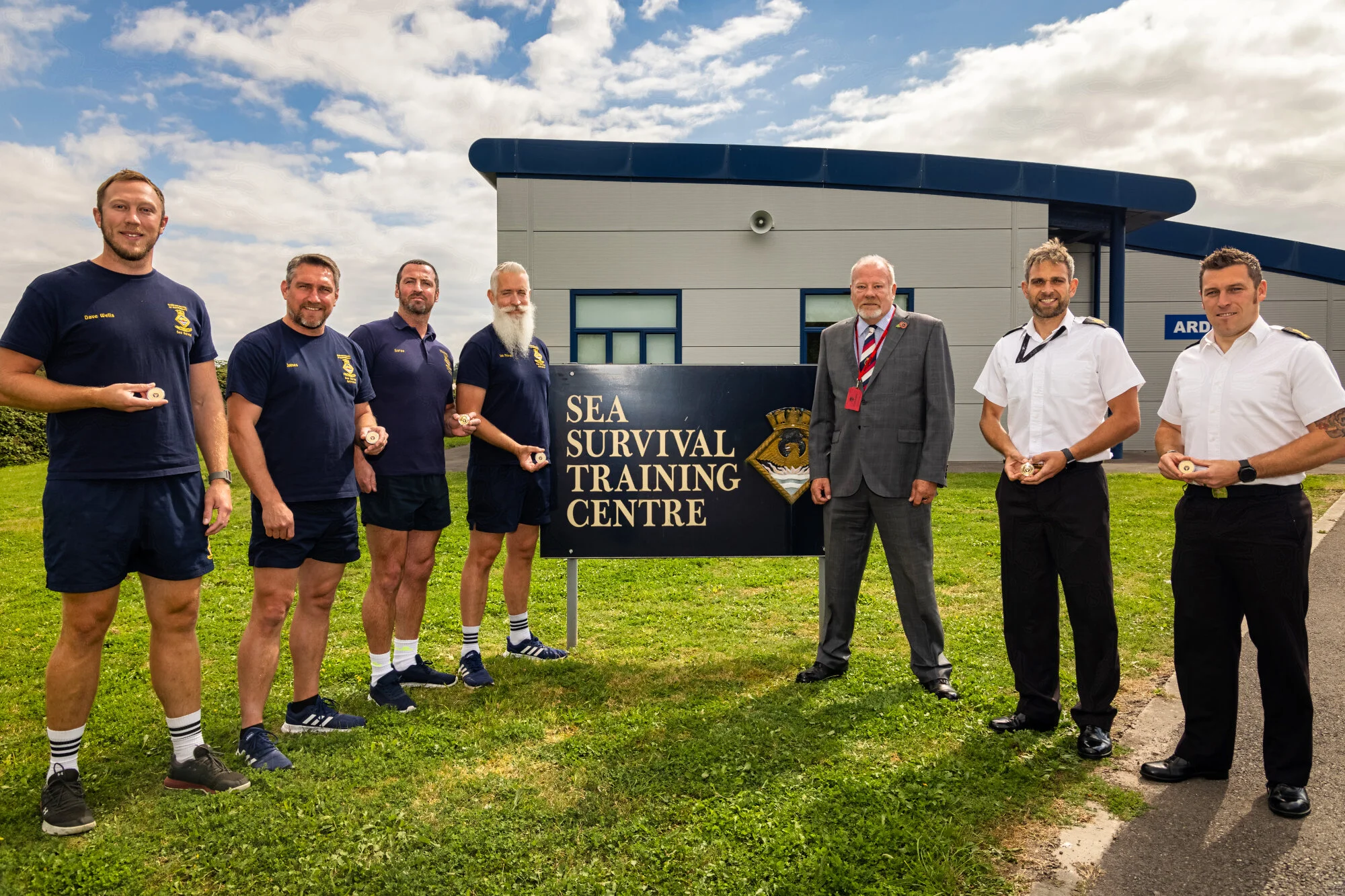 Ardent survivor Ken Enticknap with the team from the Royal Navy Sea Survival School.